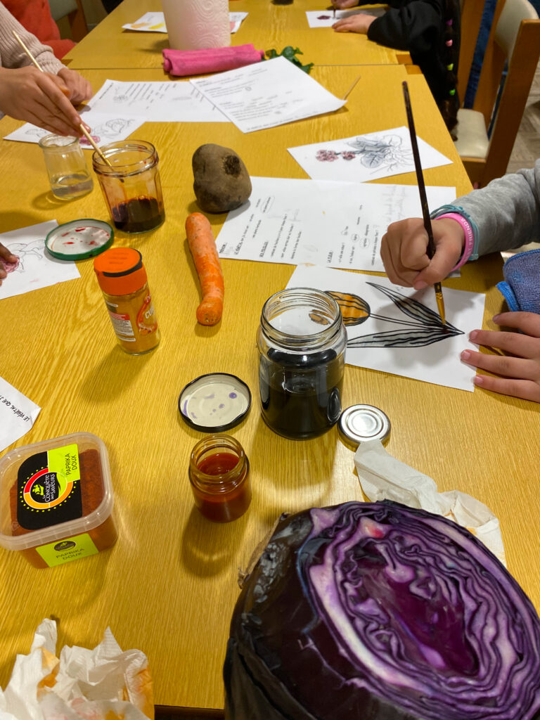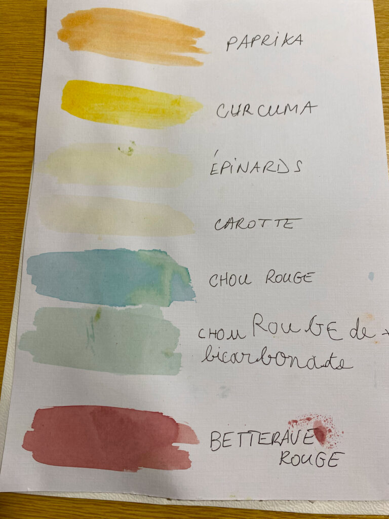 Nous avons fait des tests de couleurs végétales avec les pétales et les feuilles, puis avec des fruits, légumes et épices. Notre mission (accomplie) : obtenir des teintes proches de celles des fleurs !